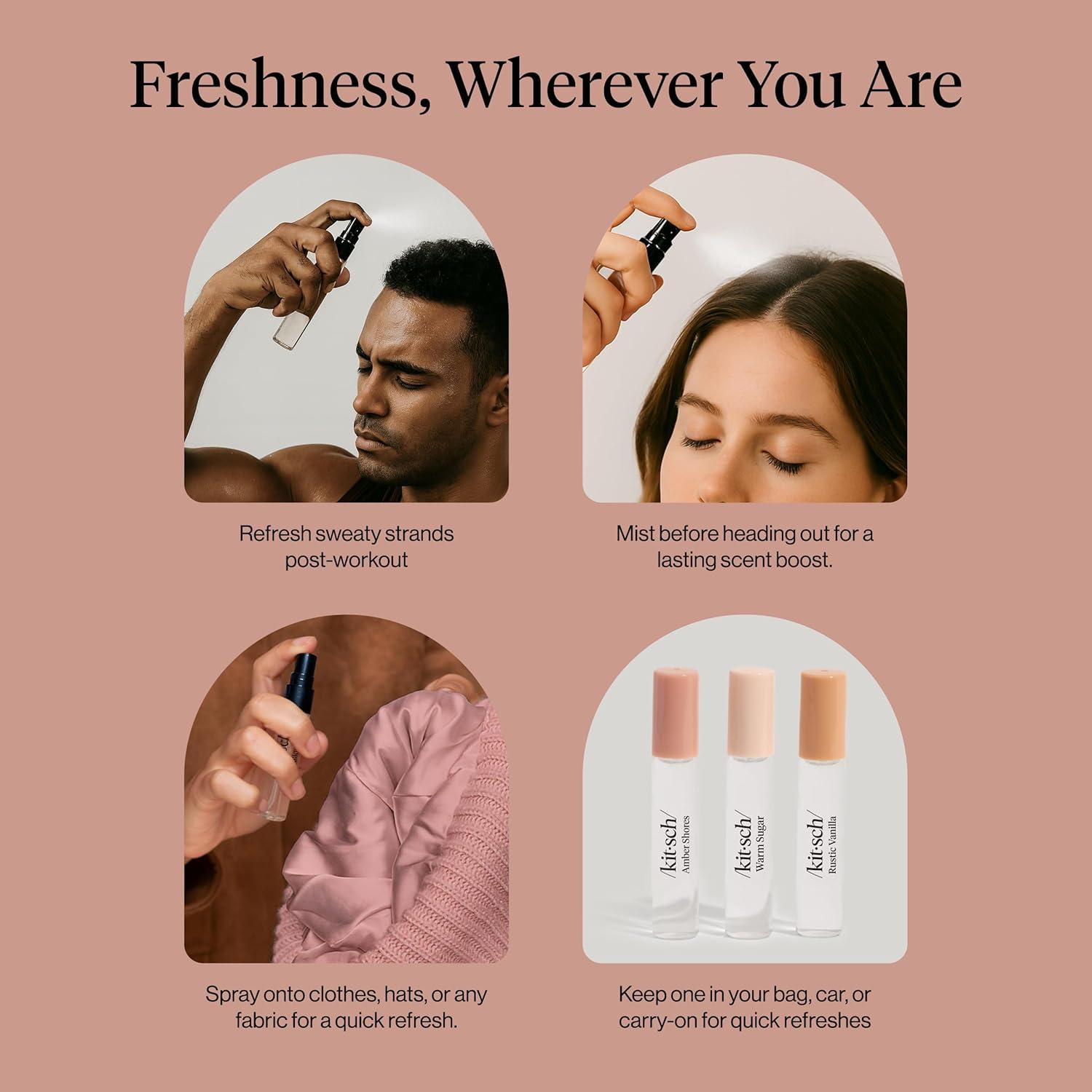 Kitsch Hair Perfume for Women – Trio Set | Clean, Deodorizing & Patented Odor-Eliminating Technology Hair Spray & Body Mist – Freshen Hair, Pillows – Amber Shores, Warm Sugar, Rustic Vanilla, 3x10mL