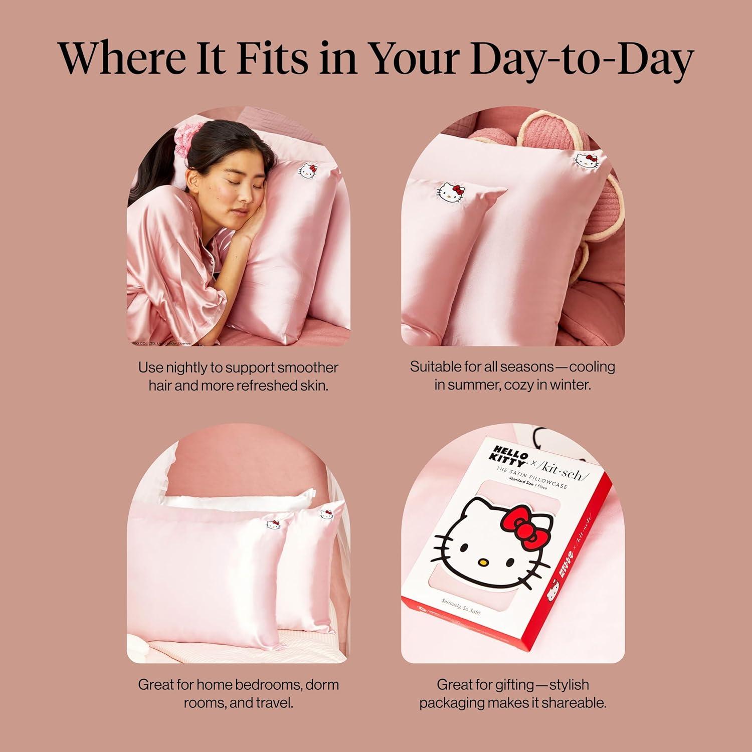 Kitsch x BT21 Satin Pillowcase with Zipper – Better Than Silk Pillowcase, Koya Character & Funky Floral Print – Soft Cooling Toddler Bed Time Pillow Case for Hair & Skin – Queen/Standard 19×26(Hello Kitty – Pink Kitty Face)