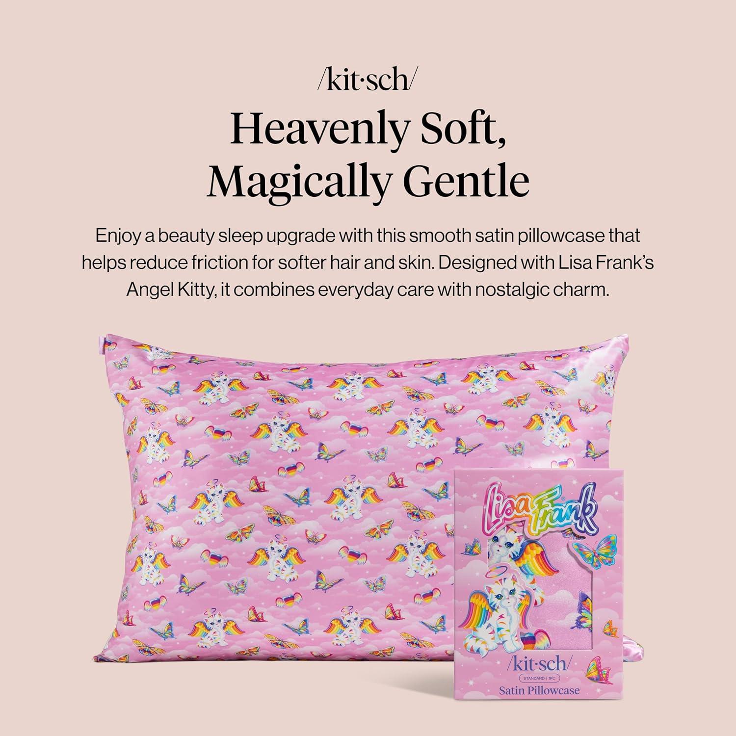 Kitsch x Lisa Frank Satin Pillowcase with Zipper for Hair & Skin, Softer Than Silk Pillow Cases Queen, Wrinkle-Free, Smooth and Cooling Satin Pillow Covers Standard/Queen Size 19x26 - Angel Kitty(Hello Kitty - Ivory)