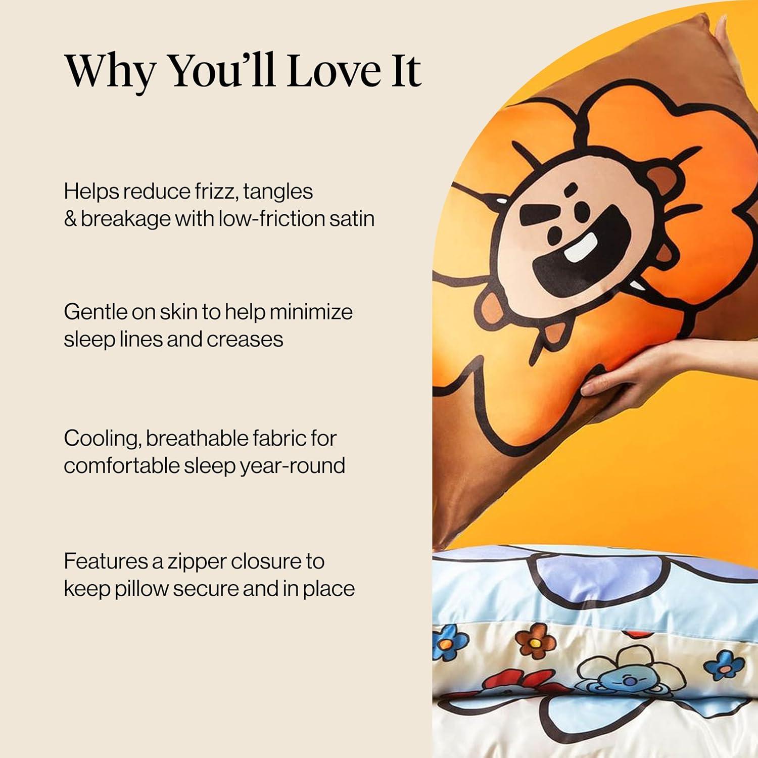 Kitsch x BT21 Satin Pillowcase with Zipper – Better Than Silk Pillowcase, Koya Character & Funky Floral Print – Soft Cooling Toddler Bed Time Pillow Case for Hair & Skin – Queen/Standard 19×26(Cindy Lou)