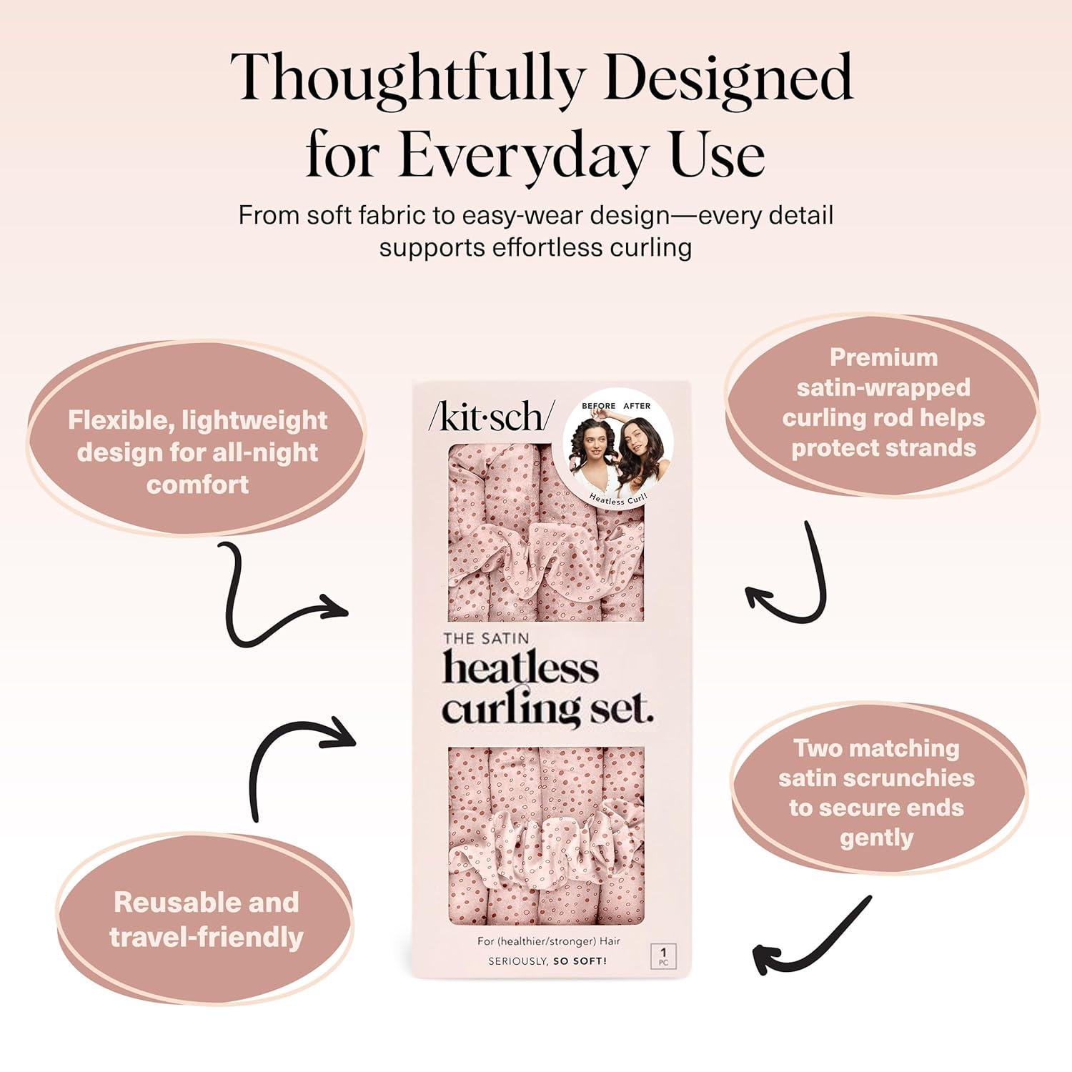 • Hello Kitty x Kitsch Satin Heatless Hair Curler Set – Heatless Curls Overnight, Hair Rollers for Soft Curls & Frizz-Free Styling, No Heat Curlers To Sleep in, Curling Rod Headband – Pink Kitty Faces(Champagne)